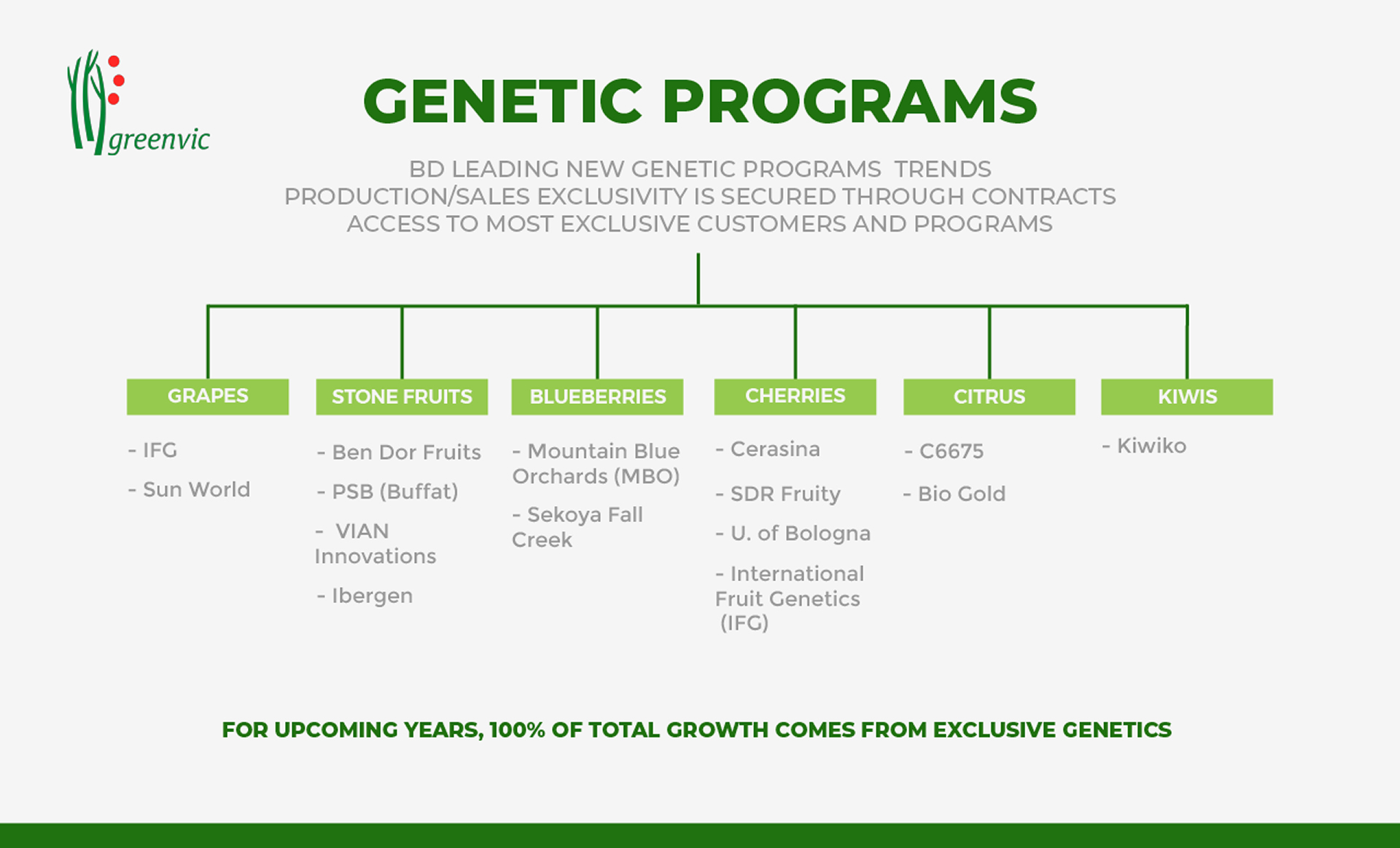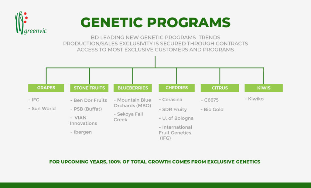 En Greenvic, nuestros programas genéticos están diseñados para alcanzar los más altos estándares de calidad en cada uno de nuestros productos, adaptándolos a las preferencias específicas de nuestros clientes. Buscamos no solo satisfacer las demandas de los mercados internacionales, sino también diferenciarnos mediante la innovación en cada variedad que cultivamos.